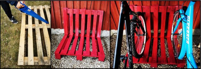 Gör ett cykelställ av en pall genom att såga pallen på mitten, se bild, sätt de två delarna i vinkel. Gör den stabil genom att skruva ihop de två delarna. Måla gärna med någon fin färg för att pigga upp! För mer inspiration gå gärna in på pinterest där det finns många olika förslag på pyssel med emballage.